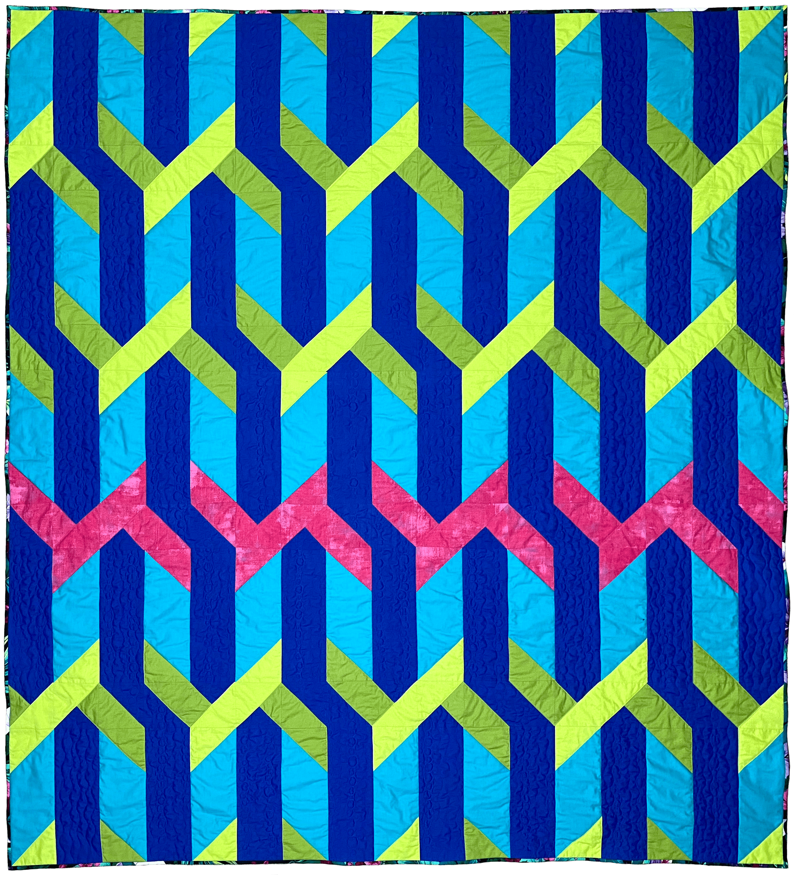Susan went with beautiful green choices, and her quilt top really evokes natural twists of greenery and vines. Her contrast fabric twist is more subtle, but really works with her color story. She’s the fastest quilter I know, and I was so happy that she wanted to test for me again!